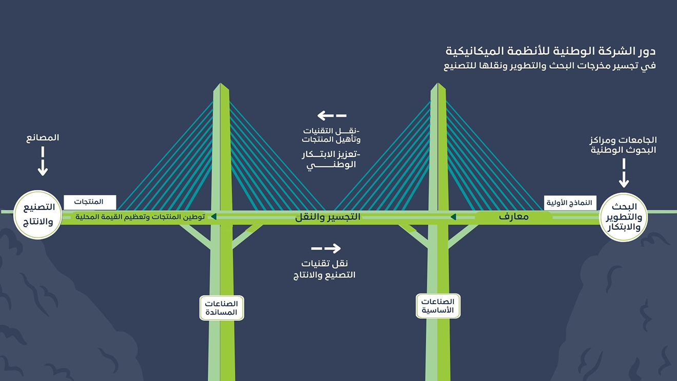 نعمل على التجسير و ردم الفجوة بين البحث والتطوير والتصنيع حيث أن العديد من الابتكارات تتوقف عند مرحلة النماذج الأولية، في حين يحتاج القطاع الصناعي إلى نماذج قابلة للتصنيع والإنتاج لذا أوجدنا حلول للتجسير تعمل على تحويل مخرجات البحث إلى حلول صناعية عملية و نقل التقنيات المحلية و توفير تغذية راجعة تعزز الابتكار و دعم التصنيع لبناء رابط حيوي وبناء اقتصاد معرفي وتمكين صناعة وطنية منافسة.